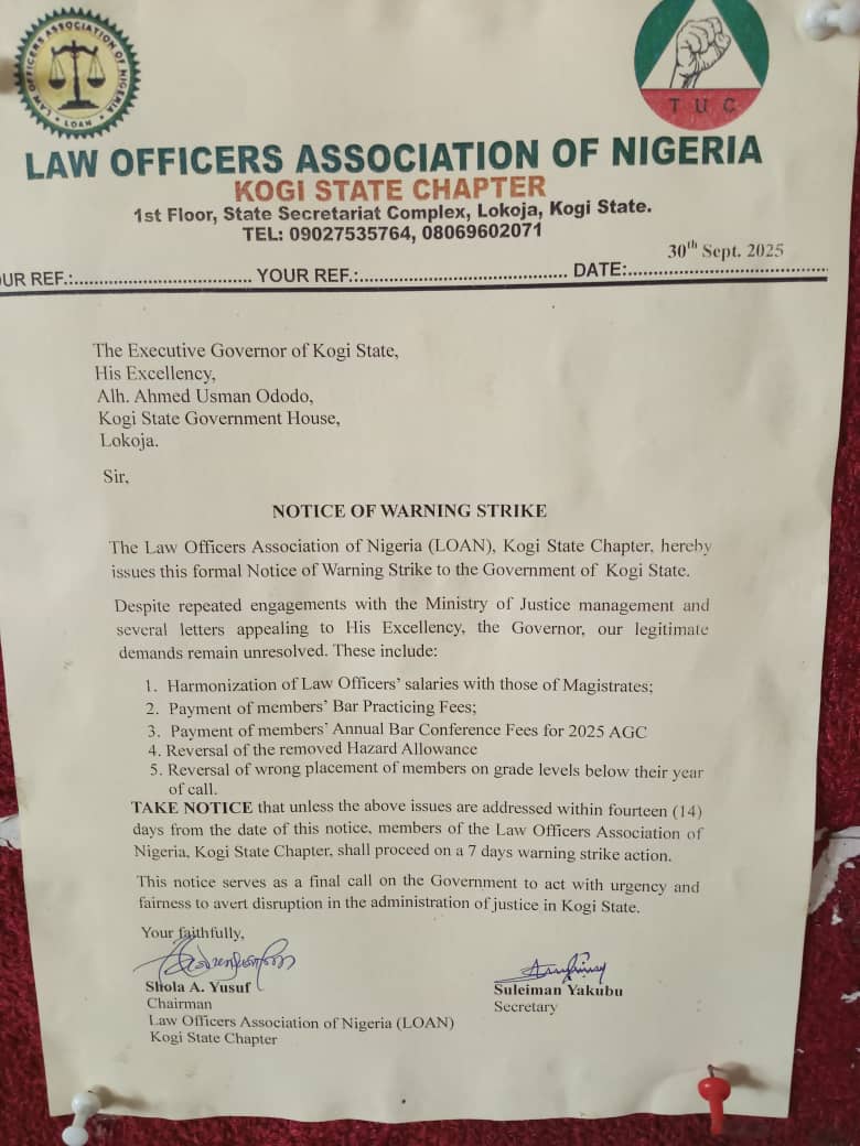 The Law Officers Association of Nigeria (LOAN), Kogi State Chapter, has issued a formal notice of a seven-day warning strike to the State government over unresolved welfare demands.