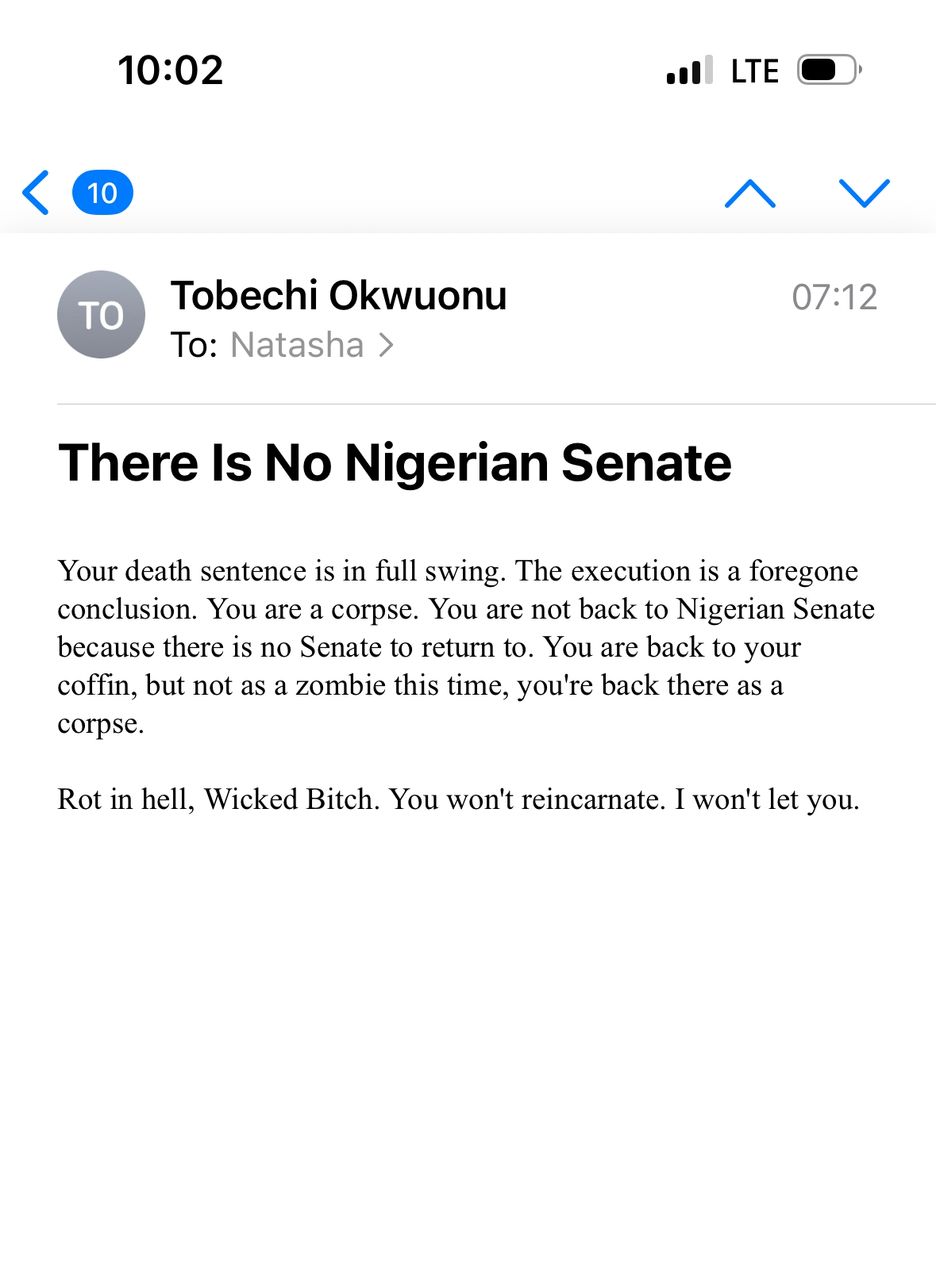 Titled “There Is No Nigerian Senate,” the menacing message declared, “Your death sentence is in full swing. The execution is a foregone conclusion. You are a corpse. You are not back to Nigerian Senate because there is no Senate to return to. You are back to your coffin, but not as a zombie this time, you’re back there as a corpse.” It further stated, “Rot in hell, Wicked Bitch. You won’t reincarnate. I won’t let you.”